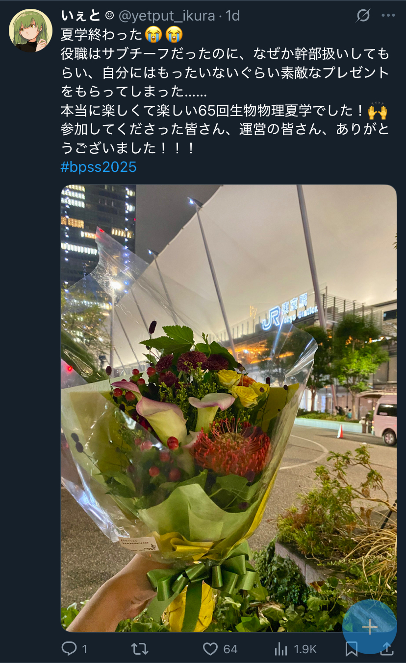 私が関わっているのは「生物物理若手の会夏の学校」、通称「生物物理夏学」。これが、私にとっての「夏学」。第63回(滋賀, 2023年)が初参加で、第64回(北海道, 2024年)が初運営、第65回(千葉, 2025年)は2回目の運営です。
